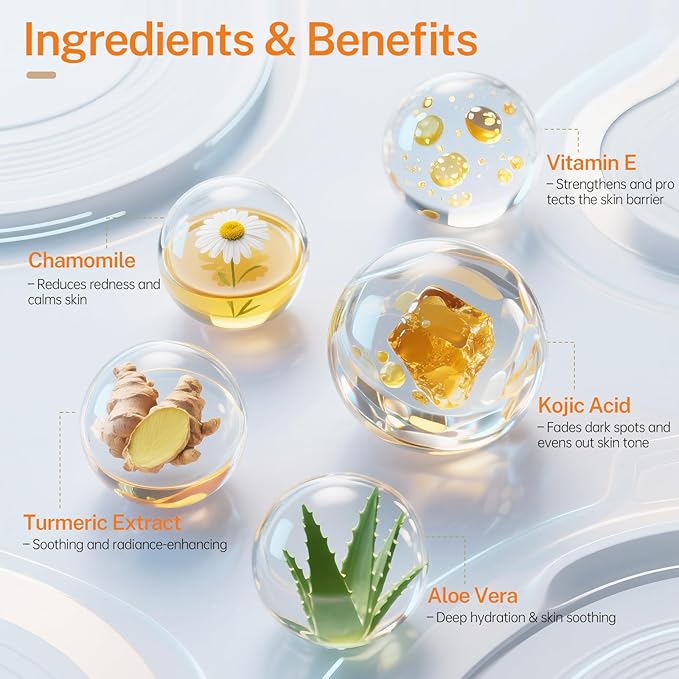 - 🌿 Éclat et uniformité : le curcuma et l’acide kojique réduisent l’apparence des taches et imperfections.